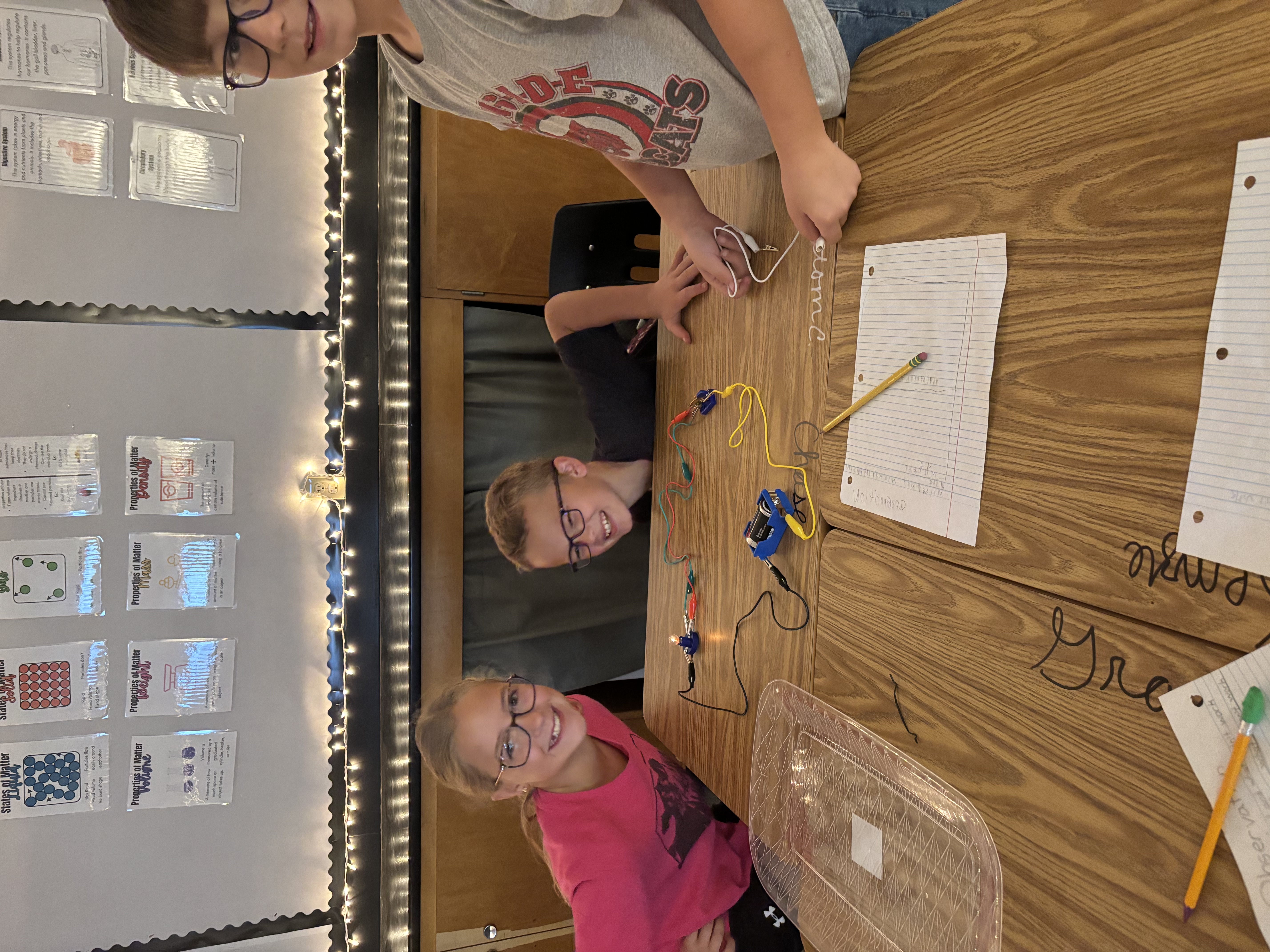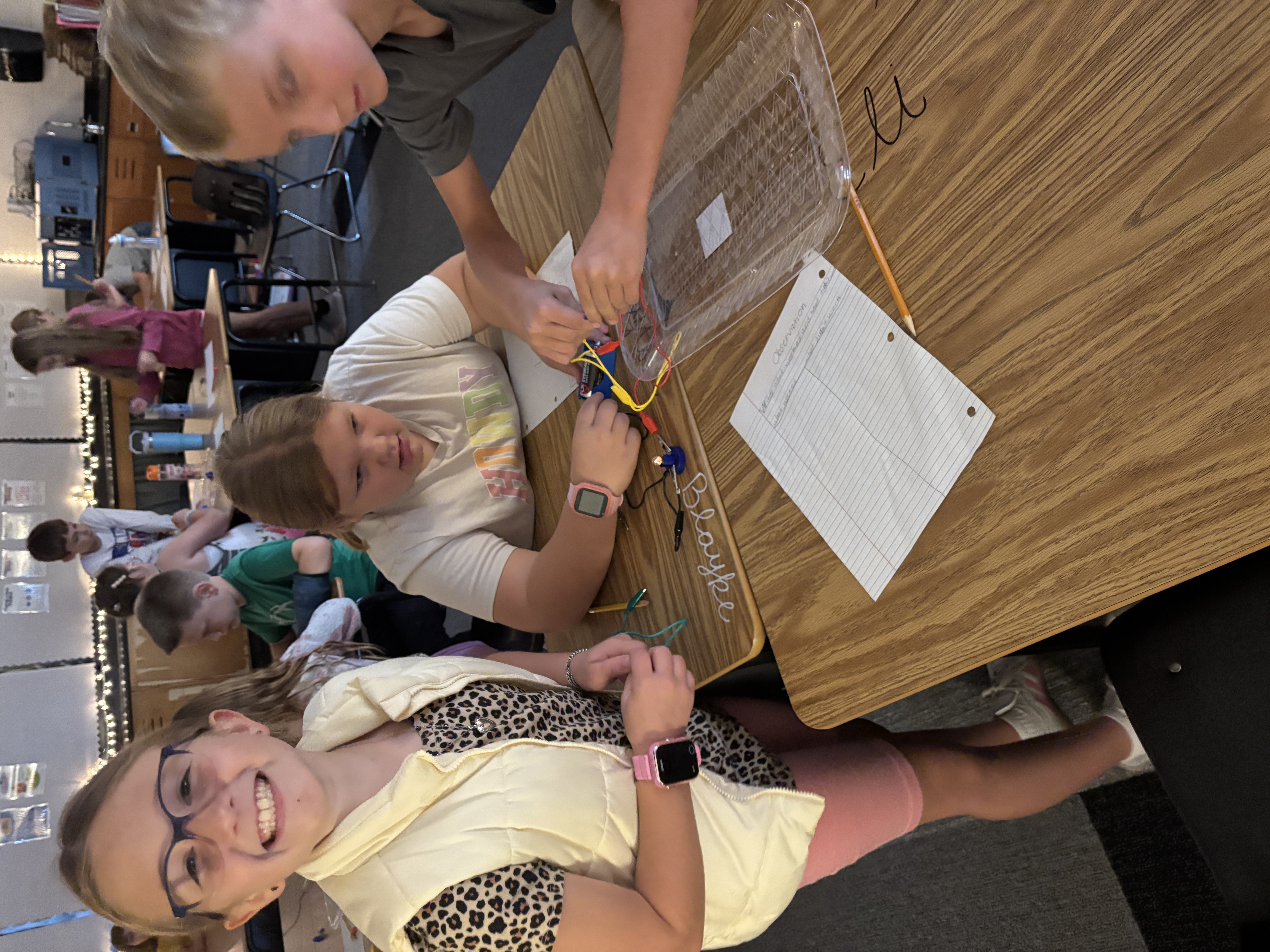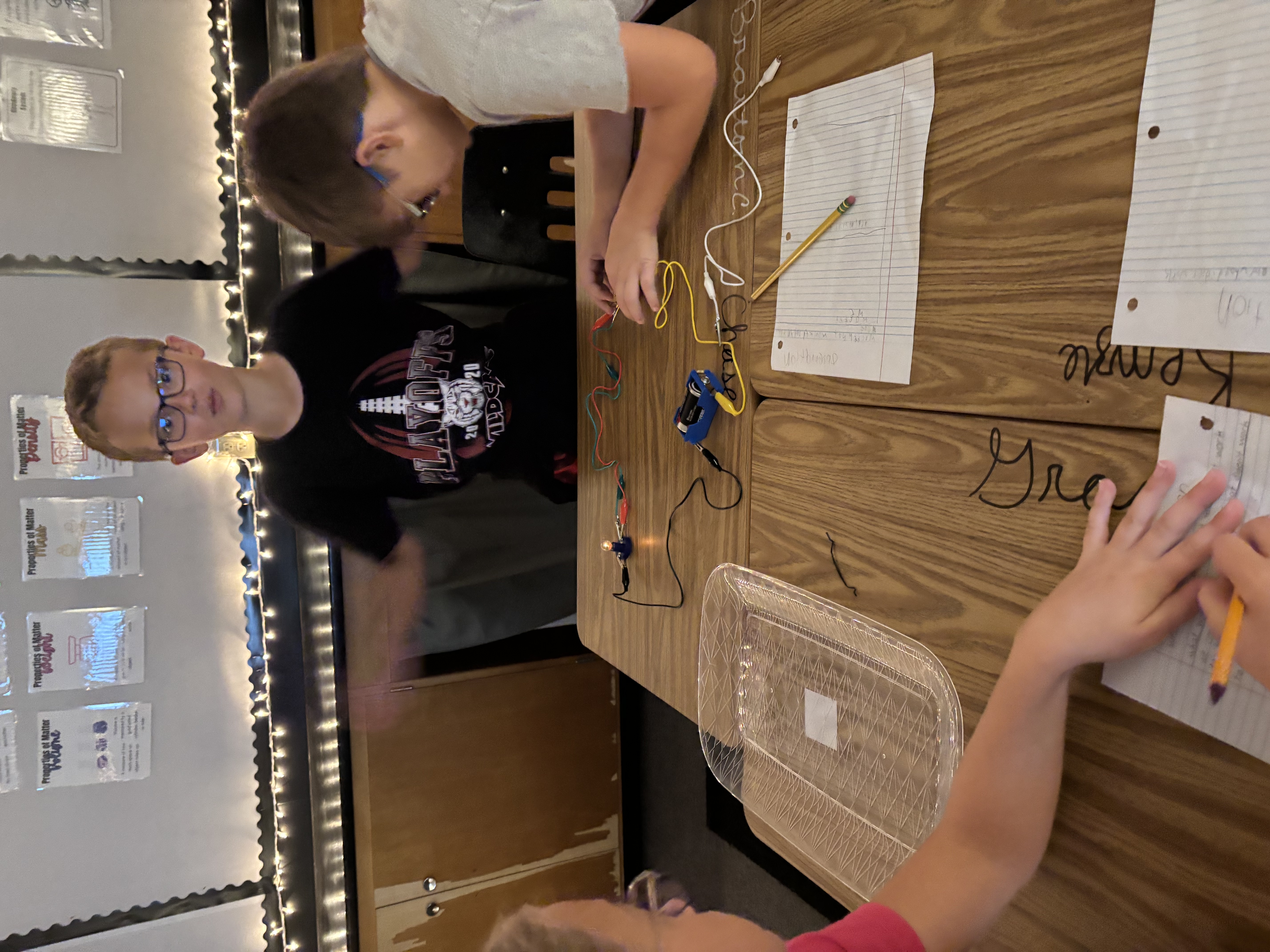 Winners of the spaghetti noodle and marshmallow competition. All three classes had to create a structure with marshmallows and spaghetti noodles strong enough to hold their science book. Only ONE group out of all three classes accomplished the task!