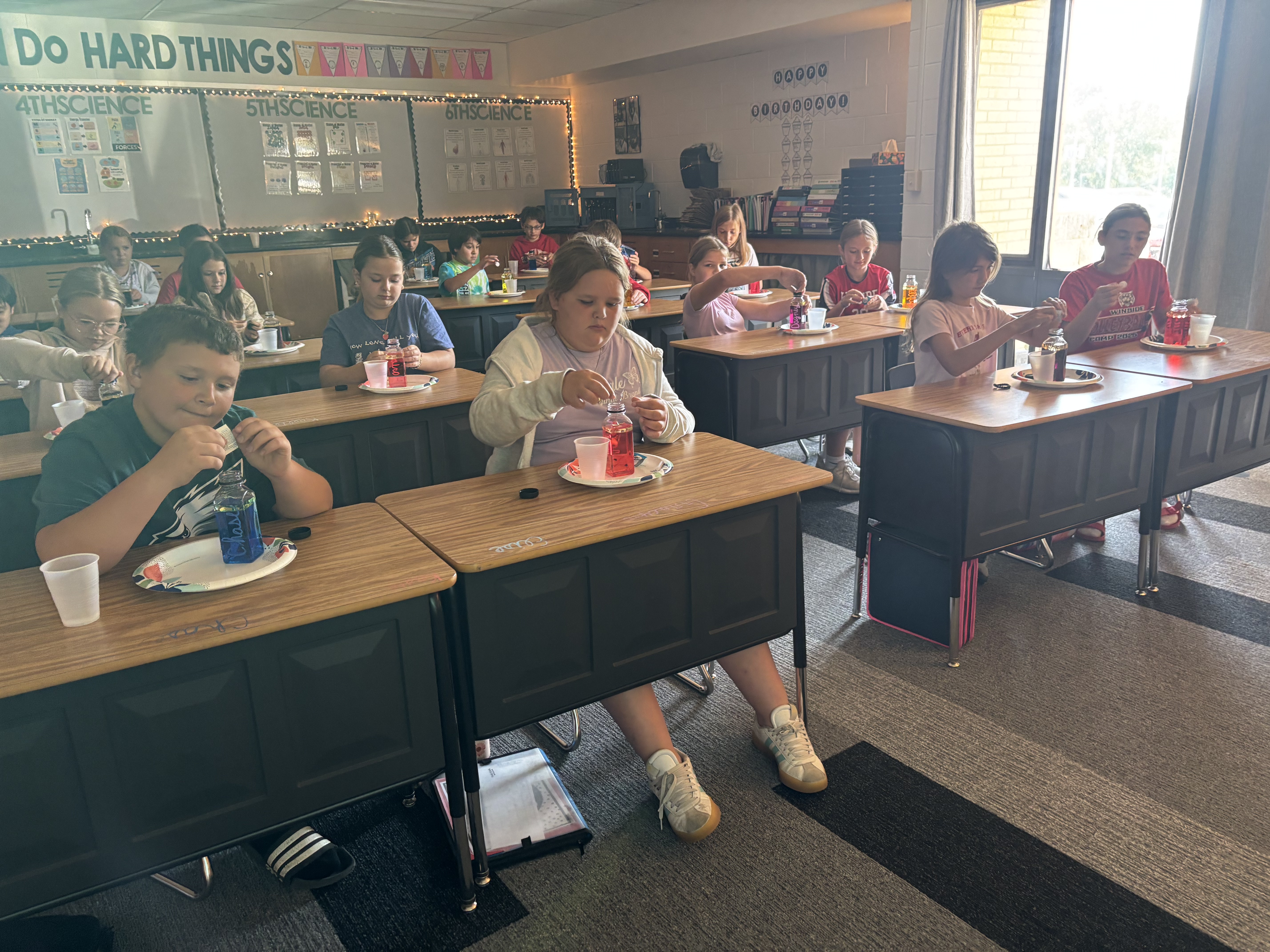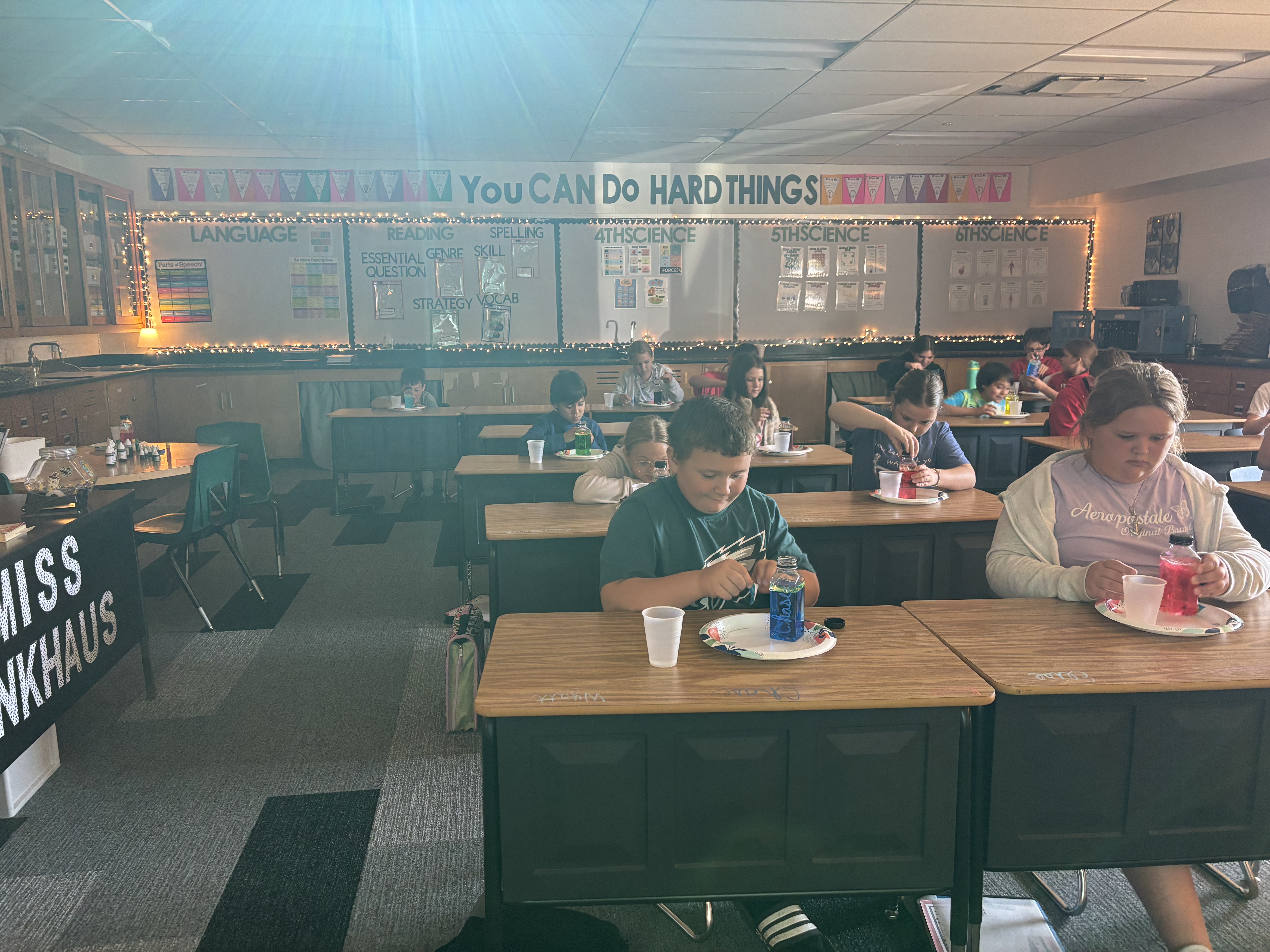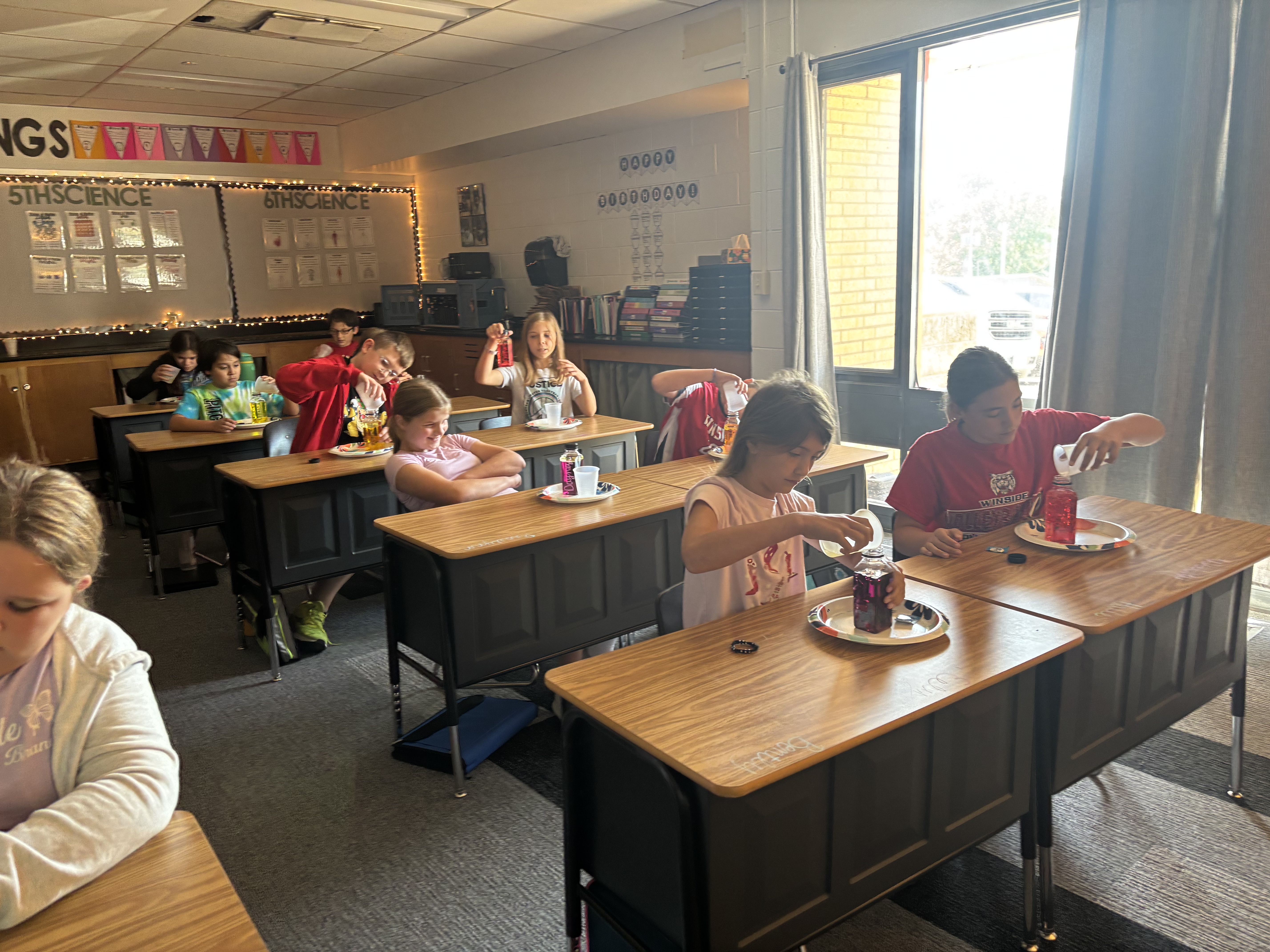 Winners of the spaghetti noodle and marshmallow competition. All three classes had to create a structure with marshmallows and spaghetti noodles strong enough to hold their science book. Only ONE group out of all three classes accomplished the task!